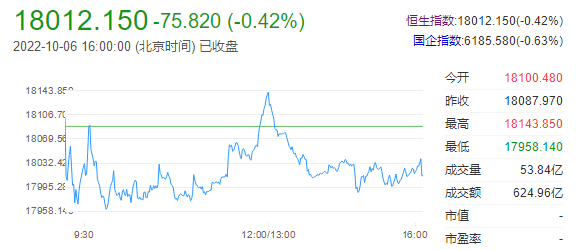 10月6日下午,港股收盘,两大指数小幅收跌,恒指收跌0.42%,报18012.15点;恒生科技指数收跌0.67%,报3660.72点。港股后市展望:中金公司认为,投资者可能等待二十大会议的召开,并从中寻求更为清晰的政策信号,因此未来几周市场可能处于持续盘整中。在目前水平市场的上涨空间大于下跌风险。在此之前,以港元计价的高股息收益率个股对投资者而言可能是较好的选择,可以提供下行保护和对冲人民币贬值的负面影响。另外,优质成长个股(例如增长维持高景气或者存在盈利反转可能的板块或标的)可能仍然是较好的选择。中期来看,我们判断市场出现反转或将取决于以下两个因素的兑现:1)美联储放缓加息步伐;2)有更明确证据显示中国经济增长正在摆脱低谷。