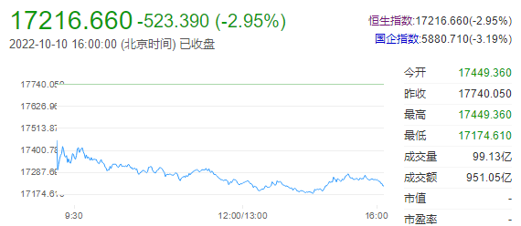 截至收盘,恒生指数跌2.95%,报17216.66点;国企指数跌3.19%,红筹指数跌1.83%。恒生科技指数跌3.98%,比亚迪电子跌10.96%,哔哩哔哩跌8.66%,美团跌6.71%。港股后市展望:中金公司预计市场短期或将继续盘整,但可能也会在目前水平再度彰显韧性,建议投资者关注海外和国内政策潜在转变,政策转向有望成为推动市场反弹的催化剂。投资建议方面,鉴于目前宏观环境,中金公司认为提供现金流确定性的板块仍将是良好的选择,如股息支付带来的确定性或可预见性经营性现金流带来的确定性,因此,推荐高股息标的,如部分公用事业和能源板块。另外,中金公司也建议关注估值存在折价而且监管环境向好的优质成长板块,例如汽车、医疗保健、部分互联网和消费板块。