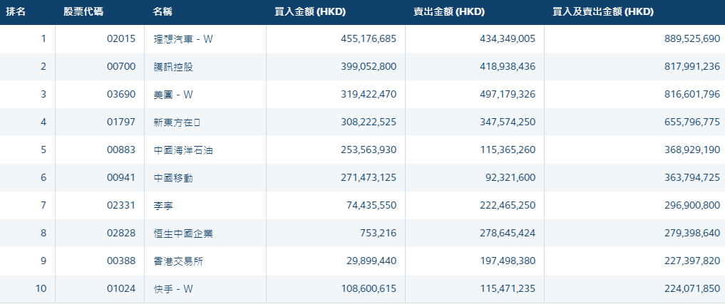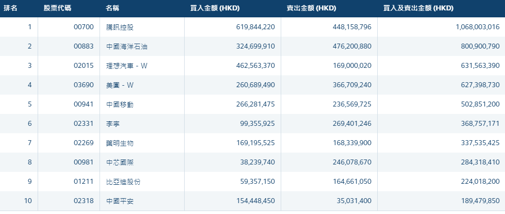 港股通(深)买卖前十股(单位:港元):