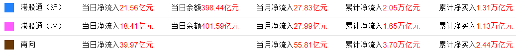南向资金方面,南下资金净流入39.96亿港元,其中港股通(沪)净流入21.56亿港元,港股通(深)净流入18.40亿港元。