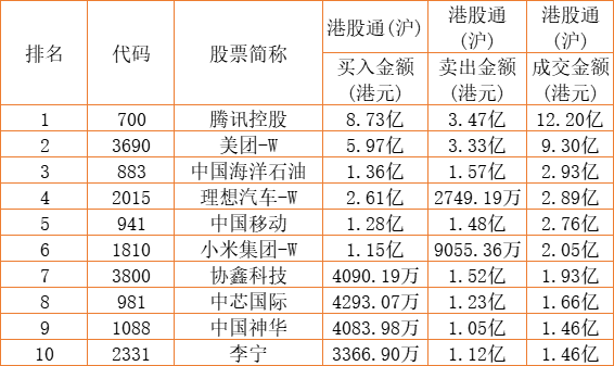 港股通(沪)买卖前十股(单位:港元):