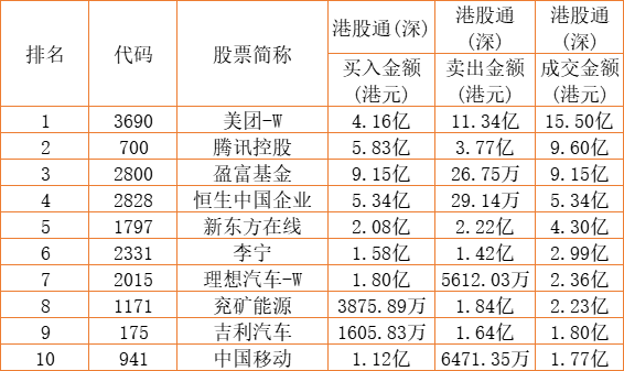 港股通(深)买卖前十股(单位:港元):