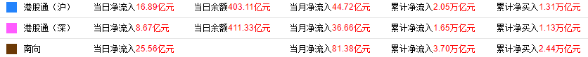 南向资金方面,南下资金净流入25.56亿港元,其中港股通(沪)净流入16.89亿港元,港股通(深)净流入8.67亿港元。