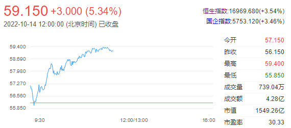 今日走势分析:李宁(02331)涨超5%。截至发稿,李宁涨5.61%,报59.3港元,成交额3.89亿港元。