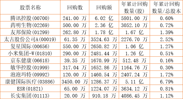 永安国际(00289)、酷派集团(02369)、景福集团(00280)、保发集团(03326)、微盟集团(02013)、天福(06868)、互太纺织(01382)、瑞安房地产(00272)、锦胜集团(控股)(00794)、朗生医药(00503)、理文造纸(02314)、中国旺旺(00151)、建业地产(00832)、金利来集团(00533)、DYNAM JAPAN(06889)、新鸿基公司(00086)、天伦燃气(01600)、希慎兴业(00014)、惠理集团(00806)、泡泡玛特(09992)、清科创业(01945)、兴胜创建(00896)、瑞安建业(00983)、东亚银行(00023)、祖龙娱乐(09990)、阅文集团(00772)、康健国际医疗(03886)、腾讯控股(00700)、胜狮货柜(00716)、数码通电讯(00315)、电能实业(00006)、赛晶科技(00580)、敏华控股(01999)、北控水务集团(00371)、中手游(00302)、创胜集团-B(06628)、太古股份公司A(00019)、京东健康(06618)、中远海运国际(00517)、友邦保险(01299)、太古股份公司B(00087)、亿都(国际控股)(00259)、名创优品(09896)、联易融科技-W(09959)、港龙中国地产(06968)、澳优(01717)、长实集团(01113)、汇量科技(01860)、复星国际(00656)、移卡(09923)、小米集团-W(01810)、康圣环球(09960)、乐声电子(00213)、摩比发展(00947)、圣诺医药-B(02257)、ESR(01821)、亿和控股(00838)、康基医疗(09997)、药明生物(02269)、赛生药业(06600)、知乎-W(02390)、中国飞鹤(06186)于2022年10月13日进行了回购。其中,回购金额最大的为腾讯控股(00700),回购数量241.00 万,回购金额6.02 亿元。