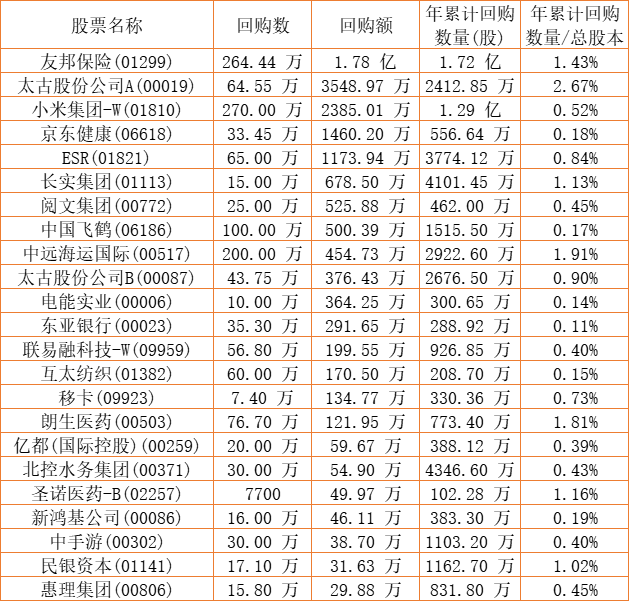 互太纺织(01382)、新鸿基公司(00086)、亿胜生物科技(01061)、东亚银行(00023)、天伦燃气(01600)、亿都(国际控股)(00259)、艾德韦宣集团(09919)、清科创业(01945)、民银资本(01141)、天福(06868)、金利来集团(00533)、惠理集团(00806)、瑞安建业(00983)、阅文集团(00772)、乐声电子(00213)、中手游(00302)、联易融科技-W(09959)、友邦保险(01299)、电能实业(00006)、创胜集团-B(06628)、汇量科技(01860)、小米集团-W(01810)、中远海运国际(00517)、太古股份公司A(00019)、北控水务集团(00371)、太古股份公司B(00087)、京东健康(06618)、长实集团(01113)、中国飞鹤(06186)、康圣环球(09960)、移卡(09923)、圣诺医药-B(02257)、和谐汽车(03836)、ESR(01821)、亿和控股(00838)、康基医疗(09997)于2022年10月17日进行了回购。其中,回购金额最大的为友邦保险(01299),回购数量264.44 万,回购金额1.78 亿元。