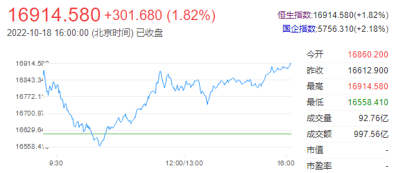 恒指收涨1.82%,报16914.58点;恒生科技指数收涨4.25%,报3336.25点。医药股全天领涨,科济药业涨近22%,信达生物涨近17%;苹果概念股午后持续走高,比亚迪电子涨近11%,舜宇光学科技、瑞声科技涨近7%。港股后市展望:天风证券认为中国宏观经济处于复苏周期,目前不应再悲观,四季度稳增长措施进一步发力值得期待,若更多积极因素出现或带动市场情绪转向乐观,港股或将迎来一段时间的反弹。互联网行业估值大概处于历史底部,政策环境改善、盈利拐点有望确立下,中期风险收益比具备吸引力。