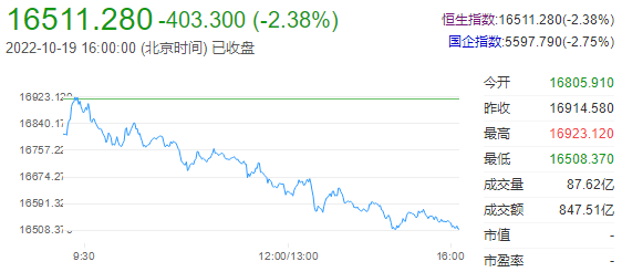 截至收盘,恒生指数跌2.38%,报16511.28点;国企指数跌2.75%,红筹指数跌0.58%。恒生科技指数跌4.19%,小鹏汽车跌近10%,哔哩哔哩、快手跌7%,蔚来跌6.6%,美团跌6%,阿里、腾讯跌超4%。港股后市展望:平安证券指出,在海外负面冲击接连影响下,港股市场在月初反弹后继续下行,即使偶尔伴随A股出现大幅反弹,尾盘也往往会出现涨幅收缩的现象,表明港股目前态势仍然偏弱。结合美联储加息节奏和内地经济前景,港股有望在年底出现走强,目前应当在做好防御的基础上,着眼中长期布局低估优质资产,除盈利稳健的白马股之外,港股可选消费、互联网传媒等板块的布局机遇也值得重视。