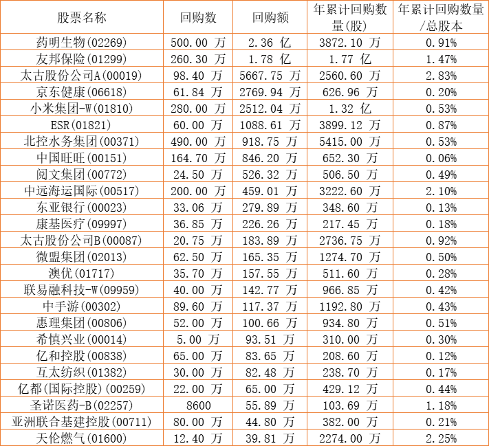 亿胜生物科技(01061)、酷派集团(02369)、阅文集团(00772)、景福集团(00280)、东亚银行(00023)、亿都(国际控股)(00259)、中国旺旺(00151)、DYNAM JAPAN(06889)、希慎兴业(00014)、新鸿基公司(00086)、天伦燃气(01600)、和谐汽车(03836)、祖龙娱乐(09990)、微盟集团(02013)、惠理集团(00806)、民银资本(01141)、清科创业(01945)、创胜集团-B(06628)、澳优(01717)、现代牙科(03600)、联易融科技-W(09959)、亚洲联合基建控股(00711)、胜狮货柜(00716)、小米集团-W(01810)、中手游(00302)、友邦保险(01299)、金利来集团(00533)、中远海运国际(00517)、乐声电子(00213)、太古股份公司A(00019)、太古股份公司B(00087)、港龙中国地产(06968)、京东健康(06618)、北控水务集团(00371)、汇量科技(01860)、康圣环球(09960)、药明生物(02269)、康基医疗(09997)、圣诺医药-B(02257)、建业地产(00832)、ESR(01821)、亿和控股(00838)于2022年10月19日进行了回购。其中,回购金额最大的为药明生物(02269),回购数量500.00 万,回购金额2.36 亿元。