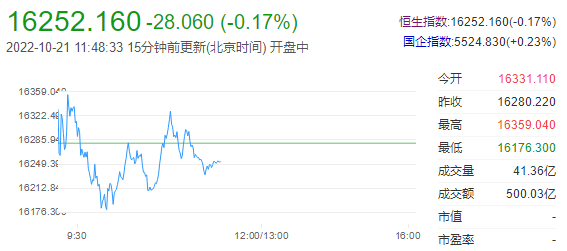 港股上午盘三大指数呈震荡行情,恒指跌0.17%,国指涨0.23%,恒生科技指数涨0.27%。南下资金半日净流入22.6亿港元,大市成交额为500亿港元。