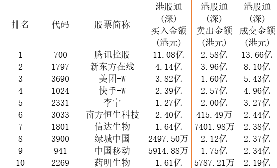 港股通(深)买卖前十股(单位:港元):