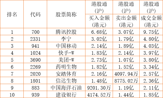 港股通(沪)买卖前十股(单位:港元):
