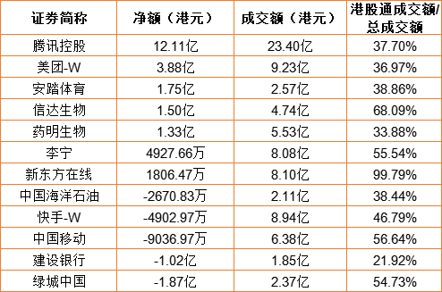 亚汇网10月21日港股通数据统计显示:腾讯控股净买入额居首,达12.11亿港元,绿城中国净卖出额居第一位。(亚汇网编辑:陌尘)