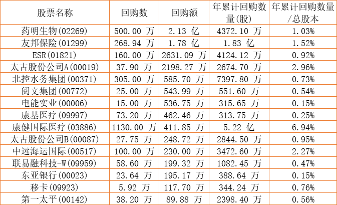 第一太平(00142)、天福(06868)、酷派集团(02369)、新鸿基公司(00086)、顺诚(00531)、金利来集团(00533)、民银资本(01141)、DYNAM JAPAN(06889)、康健国际医疗(03886)、清科创业(01945)、惠理集团(00806)、瑞安建业(00983)、亚洲联合基建控股(00711)、亿都(国际控股)(00259)、电能实业(00006)、港龙中国地产(06968)、祖龙娱乐(09990)、太古股份公司A(00019)、北控水务集团(00371)、天伦燃气(01600)、联易融科技-W(09959)、太古股份公司B(00087)、创胜集团-B(06628)、友邦保险(01299)、乐声电子(00213)、中远海运国际(00517)、汇量科技(01860)、圣诺医药-B(02257)、ESR(01821)、康圣环球(09960)、康基医疗(09997)、药明生物(02269)、移卡(09923)于2022年10月21日进行了回购。其中,回购金额最大的为药明生物(02269),回购数量500.00 万,回购金额2.13 亿元。