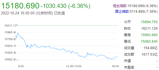 10月24日下午,截至收盘,恒生指数跌6.36%或1030.43点,报15180.69点,全日成交额1617.53亿港元;恒生国企指数跌7.30%,报5114.48点;恒生科技指数跌9.65%,报2801.99点。港股后市展望:国泰君安证券认为,恒指当前位置已基本反映市场对四季度国内经济的悲观预期,以及美国在2022、2023年的加息路径。预计短期内来自国内政策面及海外利率波动的影响边际减弱,所处的位置以及估值优势仍是目前市场博弈反弹的主要逻辑。