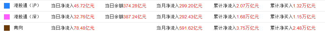 南向资金方面,南下资金净流入78.47亿港元,其中港股通(沪)净流入45.71亿港元,港股通(深)净流入32.76亿港元。