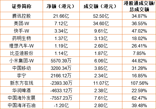 亚汇网10月25日港股通数据统计显示:腾讯控股净买入额居首,达21.66亿港元,中国海洋石油净卖出额居第一位。(亚汇网编辑:陌尘)