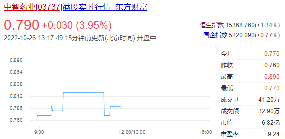 今日走势分析:中医药概念股早盘走高,截至发稿,中智药业(03737)涨7.89%,报0.82港元;同仁堂(600085)国药(03613)涨7.34%,报9.51港元;同仁堂科技(01666)涨7.26%,报4.43港元;中国中药(00570)涨6.84%,报3.28港元;华润医药(03320)涨5.67%,报5.78港元。
