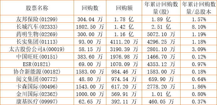 永安国际(00289)、阅文集团(00772)、东亚银行(00023)、摩比发展(00947)、瑞安房地产(00272)、朗生医药(00503)、亚洲金融(00662)、新鸿基公司(00086)、中手游(00302)、祖龙娱乐(09990)、天福(06868)、亿都(国际控股)(00259)、澳优(01717)、惠理集团(00806)、亿胜生物科技(01061)、金川国际(02362)、卡森国际(00496)、长城汽车(02333)、保发集团(03326)、和谐汽车(03836)、酷派集团(02369)、民银资本(01141)、中国旺旺(00151)、金利来集团(00533)、胜狮货柜(00716)、瑞安建业(00983)、清科创业(01945)、天伦燃气(01600)、北控水务集团(00371)、复星国际(00656)、长实集团(01113)、友邦保险(01299)、中远海运国际(00517)、汇量科技(01860)、星光集团(00403)、赛晶科技(00580)、太古股份公司A(00019)、太古股份公司B(00087)、锦胜集团(控股)(00794)、港龙中国地产(06968)、乐声电子(00213)、中裕能源(03633)、药明生物(02269)、康圣环球(09960)、康基医疗(09997)、协合新能源(00182)、移卡(09923)、ESR(01821)于2022年10月25日进行了回购。其中,回购金额最大的为友邦保险(01299),回购数量304.04 万,回购金额1.78 亿元。