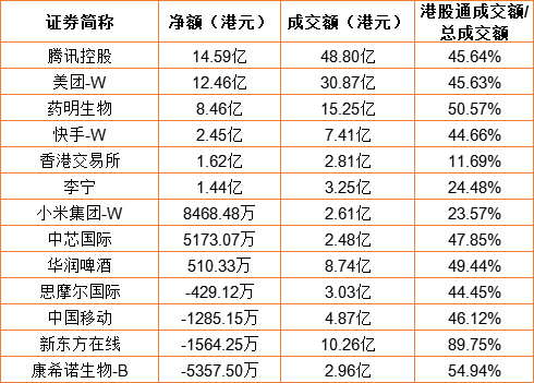 亚汇网10月26日港股通数据统计显示:腾讯控股净买入额居首,达14.59亿港元,康希诺生物-B净卖出额居第一位。(亚汇网编辑:陌尘)