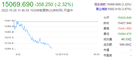 恒指早盘收跌2.32%,报15069.69点;恒生科技指数跌3.72%,报2877.98点;海运、电力板块走低,造车新势力集体走低,小鹏汽车跌近13%,理想汽车跌近8%,蔚来跌超7%。