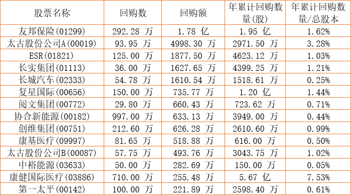 现代牙科(03600)、宝业集团(02355)、第一太平(00142)、摩比发展(00947)、和谐汽车(03836)、东亚银行(00023)、朗生医药(00503)、创维集团(00751)、阅文集团(00772)、新鸿基公司(00086)、民银资本(01141)、亿胜生物科技(01061)、中国外运(00598)、惠理集团(00806)、乐声电子(00213)、长城汽车(02333)、清科创业(01945)、联易融科技-W(09959)、天伦燃气(01600)、康健国际医疗(03886)、中裕能源(03633)、星光集团(00403)、保发集团(03326)、长实集团(01113)、金利来集团(00533)、汇量科技(01860)、复星国际(00656)、太古股份公司A(00019)、中远海运国际(00517)、太古股份公司B(00087)、北控水务集团(00371)、友邦保险(01299)、港龙中国地产(06968)、上海石油化工股份(00338)、康基医疗(09997)、ESR(01821)、东软教育(09616)、移卡(09923)、康圣环球(09960)、协合新能源(00182)、知乎-W(02390)于2022年10月27日进行了回购。其中,回购金额最大的为友邦保险(01299),回购数量292.28 万,回购金额1.78 亿元。