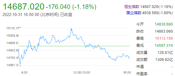 10月31日,港股收盘,两大指数分化,恒生指数跌1.18%,报收14687.02点;恒生科技指数涨1.05%,报收2852.57点。港股后市展望:国海证券认为,在经历长期、较深的下行之后,港股当前的估值已经较具吸引力。一方面,电信运营商、国有大行的股息率已经接近甚至超过10%;另一方面,恒生科技指数的PE(TTM)已经从高位的50倍下行至当前的35倍。但该券商机构指出,港股的大行情至少需要等待两个核心因素:1)中国经济复苏(我们预判在1Q23);2)美联储货币政策扭转(我们认为在1Q23末-2Q23初)。