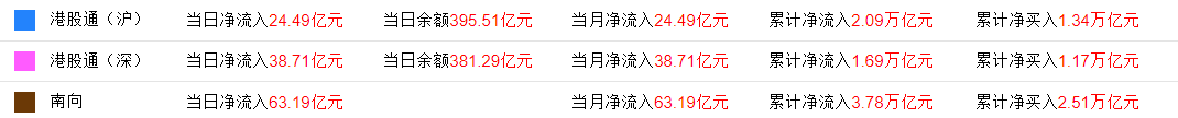 今日,南向资金方面,南下资金净流入6318亿港元,其中港股通(沪)净流入24.48亿港元,港股通(深)净流入38.70亿港元。