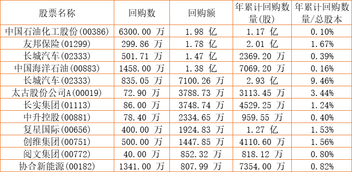 第一太平(00142)、亚洲金融(00662)、酷派集团(02369)、ASMPT(00522)、天福(06868)、中国外运(00598)、摩比发展(00947)、东亚银行(00023)、绿城服务(02869)、佐丹奴国际(00709)、金茂源环保(06805)、创维集团(00751)、朗生医药(00503)、阅文集团(00772)、澳优(01717)、中国石油化工股份(00386)、亿胜生物科技(01061)、惠理集团(00806)、石四药集团(02005)、北控水务集团(00371)、建业地产(00832)、长城汽车(02333)、祖龙娱乐(09990)、中国海洋石油(00883)、中远海运国际(00517)、创胜集团-B(06628)、希慎兴业(00014)、民银资本(01141)、上海石油化工股份(00338)、港龙中国地产(06968)、天伦燃气(01600)、瑞安建业(00983)、复星国际(00656)、长城汽车(02333)、康健国际医疗(03886)、长实集团(01113)、泡泡玛特(09992)、太古股份公司A(00019)、太古股份公司B(00087)、ESR(01821)、友邦保险(01299)、汇量科技(01860)、东软教育(09616)、康圣环球(09960)、永达汽车(03669)、赛晶科技(00580)、康基医疗(09997)、协合新能源(00182)、移卡(09923)、中升控股(00881)、知乎-W(02390)于2022年10月31日进行了回购。其中,回购金额最大的为中国石油化工股份(00386),回购数量6300.00 万,回购金额1.98 亿元。
