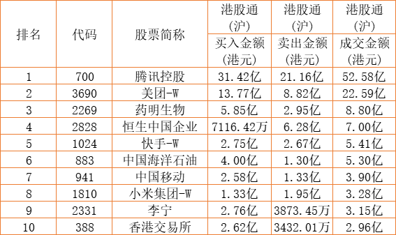 港股通(沪)买卖前十股(单位:港元):