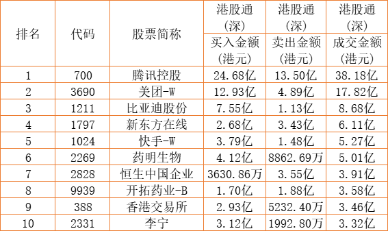 港股通(深)买卖前十股(单位:港元):