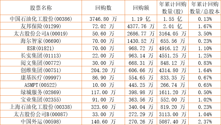 摩比发展(00947)、第一太平(00142)、和谐汽车(03836)、东亚银行(00023)、亿胜生物科技(01061)、ASMPT(00522)、阅文集团(00772)、酷派集团(02369)、民银资本(01141)、天福(06868)、朗生医药(00503)、天鸽互动(01980)、中国石油化工股份(00386)、绿城服务(02869)、澳优(01717)、港龙中国地产(06968)、瑞安建业(00983)、中远海运国际(00517)、创胜集团-B(06628)、惠理集团(00806)、上海石油化工股份(00338)、北控水务集团(00371)、友邦保险(01299)、协合新能源(00182)、长实集团(01113)、太古股份公司A(00019)、太古股份公司B(00087)、康基医疗(09997)、康圣环球(09960)、海尔智家(06690)、天伦燃气(01600)、汇量科技(01860)、ESR(01821)、移卡(09923)、知乎-W(02390)于2022年11月1日进行了回购。其中,回购金额最大的为中国石油化工股份(00386),回购数量3746.80 万,回购金额1.19 亿元。
