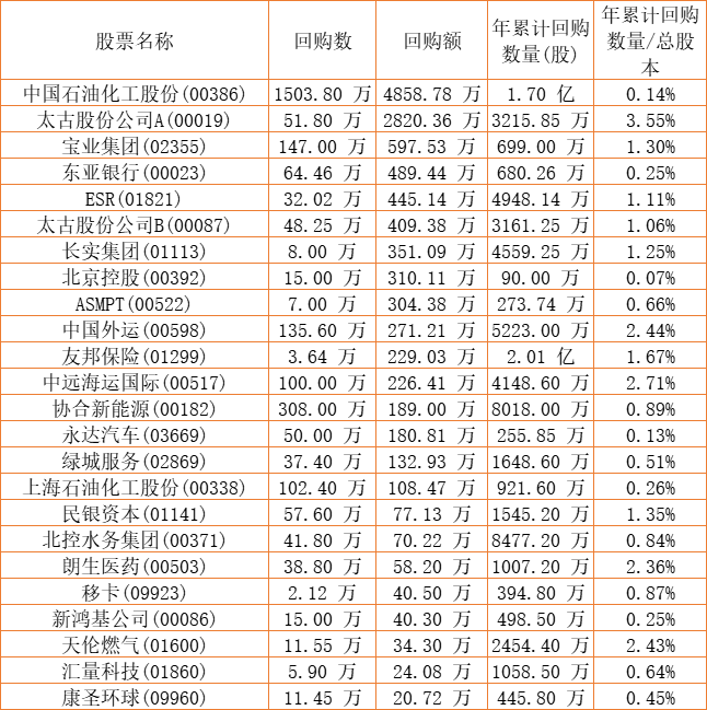 和谐汽车(03836)、永安国际(00289)、东亚银行(00023)、中国外运(00598)、天鸽互动(01980)、佐丹奴国际(00709)、天福(06868)、东软教育(09616)、友邦保险(01299)、中国石油化工股份(00386)、绿城服务(02869)、新鸿基公司(00086)、长实集团(01113)、北京控股(00392)、宝业集团(02355)、太古股份公司A(00019)、太古股份公司B(00087)、ASMPT(00522)、北控水务集团(00371)、民银资本(01141)、港龙中国地产(06968)、上海石油化工股份(00338)、ESR(01821)、朗生医药(00503)、协合新能源(00182)、中远海运国际(00517)、永达汽车(03669)、汇量科技(01860)、创胜集团-B(06628)、惠理集团(00806)、康圣环球(09960)、移卡(09923)、天伦燃气(01600)、知乎-W(02390)于2022年11月2日进行了回购。其中,回购金额最大的为中国石油化工股份(00386),回购数量1503.80 万,回购金额4858.78 万元。
