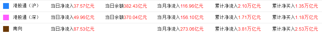 今日,南向资金方面,南下资金净流入87.52亿港元,其中港股通(沪)净流入37.57亿港元,港股通(深)净流入49.95亿港元。