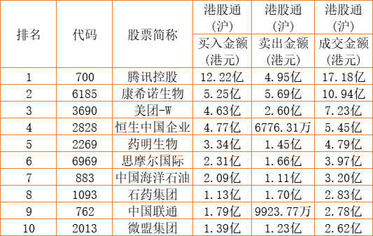 港股通(沪)买卖前十股(单位:港元):