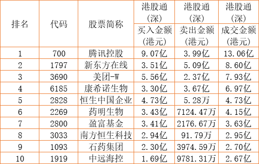 港股通(深)买卖前十股(单位:港元):