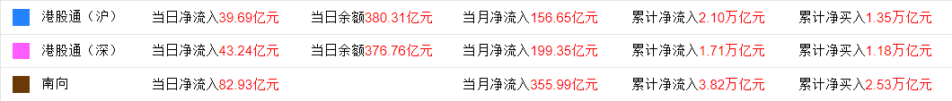 今日,南下资金净流入82.92亿港元,其中港股通(沪)净流入39.68亿港元,港股通(深)净流入43.24亿港元。