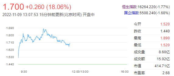 今日走势分析:碧桂园(02007)早盘大涨逾30%,截至发稿,涨25.69%,报1.81港元,成交额12亿港元。