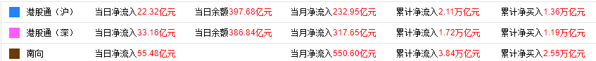 今日,南下资金净流入55.47亿港元,其中港股通(沪)净流入22.31亿港元,港股通(深)净流入33.16亿港元。