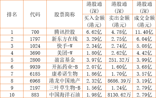 港股通(深)买卖前十股(单位:港元):