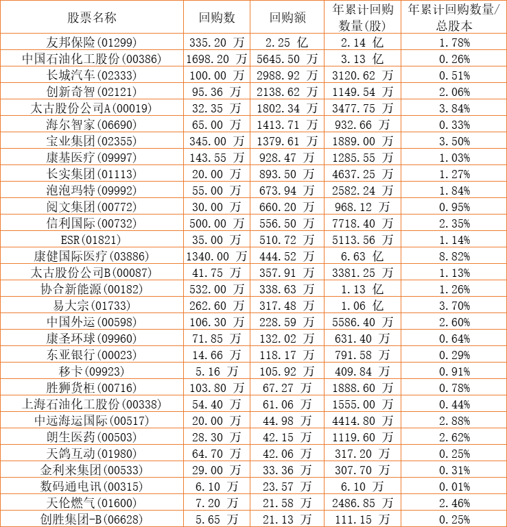 宝业集团(02355)、金利来集团(00533)、阅文集团(00772)、摩比发展(00947)、东亚银行(00023)、泡泡玛特(09992)、胜狮货柜(00716)、民银资本(01141)、和谐汽车(03836)、中国外运(00598)、酷派集团(02369)、上海石油化工股份(00338)、天鸽互动(01980)、太古股份公司A(00019)、惠理集团(00806)、信利国际(00732)、太古股份公司B(00087)、创新奇智(02121)、天福(06868)、康健国际医疗(03886)、长城汽车(02333)、天伦燃气(01600)、中国石油化工股份(00386)、清科创业(01945)、长实集团(01113)、数码通电讯(00315)、易大宗(01733)、友邦保险(01299)、中远海运国际(00517)、协合新能源(00182)、创胜集团-B(06628)、汇量科技(01860)、ESR(01821)、海尔智家(06690)、东软教育(09616)、移卡(09923)、康圣环球(09960)、康基医疗(09997)于2022年11月10日进行了回购。其中,回购金额最大的为友邦保险(01299),回购数量335.20 万,回购金额2.25 亿元。