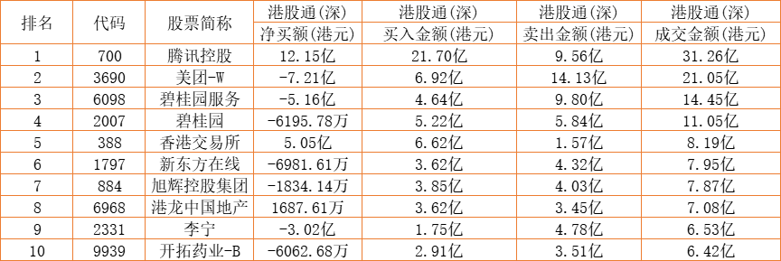 港股通(深)买卖前十股(单位:港元):