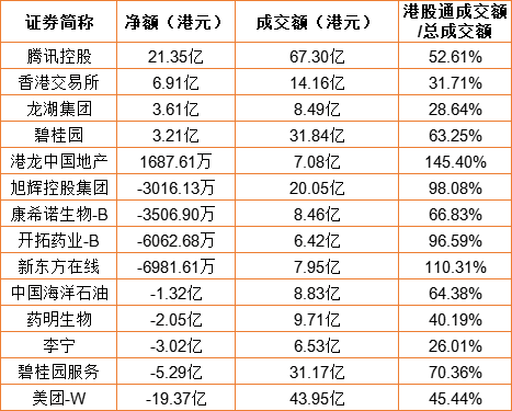 亚汇网11月14日港股通数据统计显示:腾讯控股净买入额居首,达21.35亿港元,美团-W净卖出额居第一位。(亚汇网编辑:陌尘)