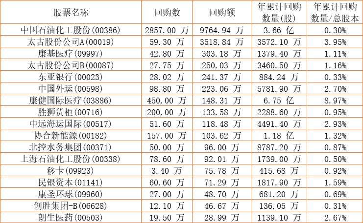 中国石油化工股份(00386)、天福(06868)、中国外运(00598)、朗生医药(00503)、东软教育(09616)、东亚银行(00023)、康健国际医疗(03886)、胜狮货柜(00716)、太古股份公司A(00019)、太古股份公司B(00087)、民银资本(01141)、创胜集团-B(06628)、上海石油化工股份(00338)、酷派集团(02369)、清科创业(01945)、中远海运国际(00517)、天鸽互动(01980)、北控水务集团(00371)、摩比发展(00947)、移卡(09923)、康圣环球(09960)、协合新能源(00182)、汇量科技(01860)、康基医疗(09997)于2022年11月14日进行了回购。其中,回购金额最大的为中国石油化工股份(00386),回购数量2857.00 万,回购金额9764.94 万元。