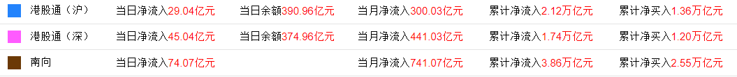 今日,南下资金净流入74.06亿港元,其中港股通(沪)净流入29.03亿港元,港股通(深)净流入45.03亿港元。