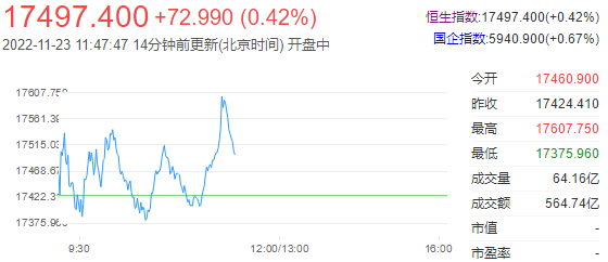 港股三大指数走势震荡,午间集体收涨,恒指涨0.42%,恒科指涨0.82%,国指涨0.67%。 南下资金半日净流入11.65亿港元,大市成交额为565亿港元。