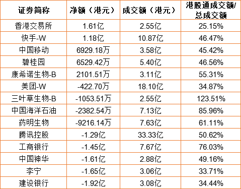 亚汇网11月23日港股通数据统计显示:香港交易所净买入额居首,达1.61亿港元,建设银行净卖出额居第一位。(亚汇网编辑:陌尘)