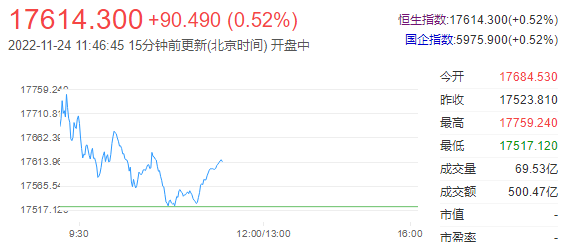 港股三大指数午间集体收涨,恒指涨0.52%,恒科指涨0.67%,国指涨0.52%。 南下资金半日净流入16.69亿港元,大市成交额为500亿港元。