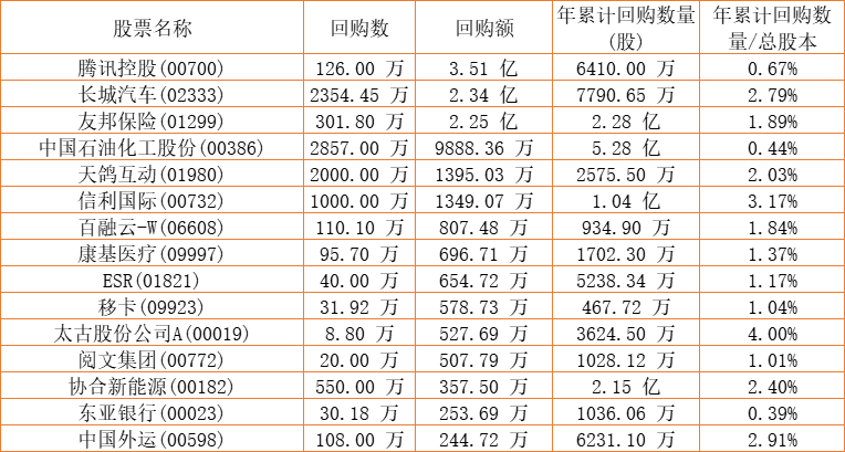 富智康集团(02038)、东亚银行(00023)、和谐汽车(03836)、阅文集团(00772)、亿胜生物科技(01061)、信利国际(00732)、天福(06868)、康健国际医疗(03886)、金利来集团(00533)、天鸽互动(01980)、中国石油化工股份(00386)、中国外运(00598)、天伦燃气(01600)、朗生医药(00503)、腾讯控股(00700)、清科创业(01945)、卡森国际(00496)、东软教育(09616)、兴胜创建(00896)、民银资本(01141)、酷派集团(02369)、太古股份公司A(00019)、太古股份公司B(00087)、百融云-W(06608)、中远海运国际(00517)、康圣环球(09960)、星盛商业(06668)、友邦保险(01299)、易大宗(01733)、协合新能源(00182)、移卡(09923)、康基医疗(09997)、ESR(01821)于2022年11月22日进行了回购。其中,回购金额最大的为腾讯控股(00700),回购数量126.00 万,回购金额3.51 亿元。