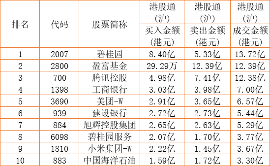 港股通(沪)买卖前十股(单位:港元):